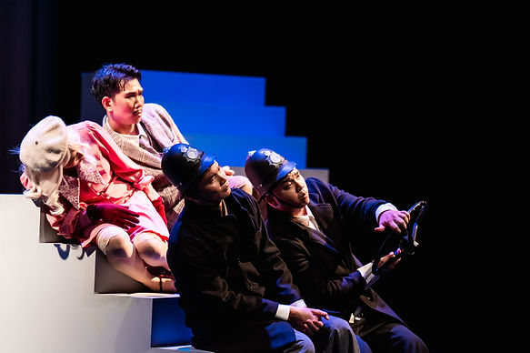 This Thai adaptation reimagines the classic spy farce through a highly physical, minimalist staging. By incorporating mime techniques and projected visuals, the production reduces the need for traditional props and sets—allowing the story to unfold through gesture, rhythm, and imagination.